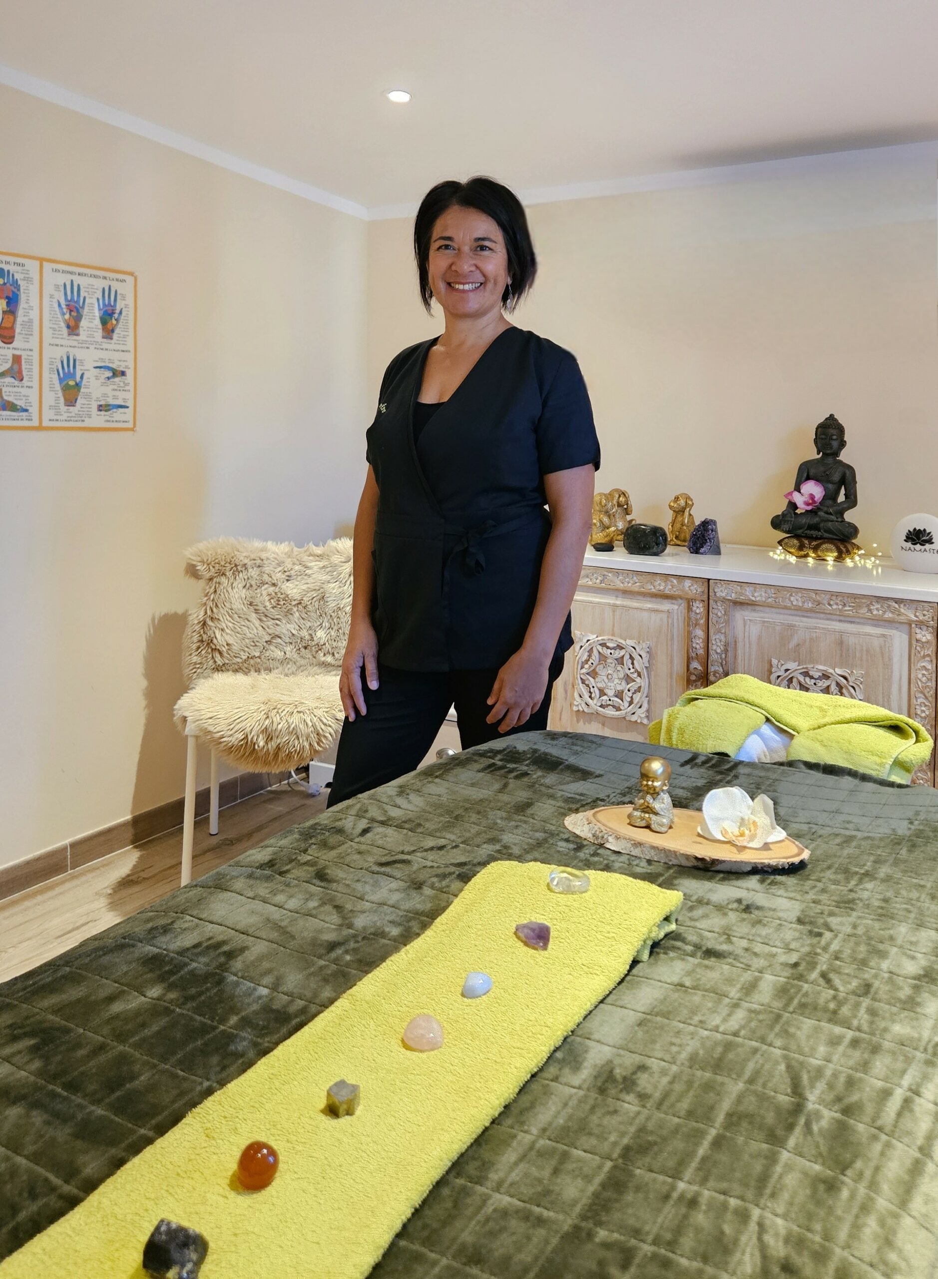 Ma reconversion professionnelle m’a conduite vers le massage bien-être avec en parrallèle diverses formations en amont en ostéothérapie, digitopuncture, magnétisme, lithothérapie et également initiations en reiki.